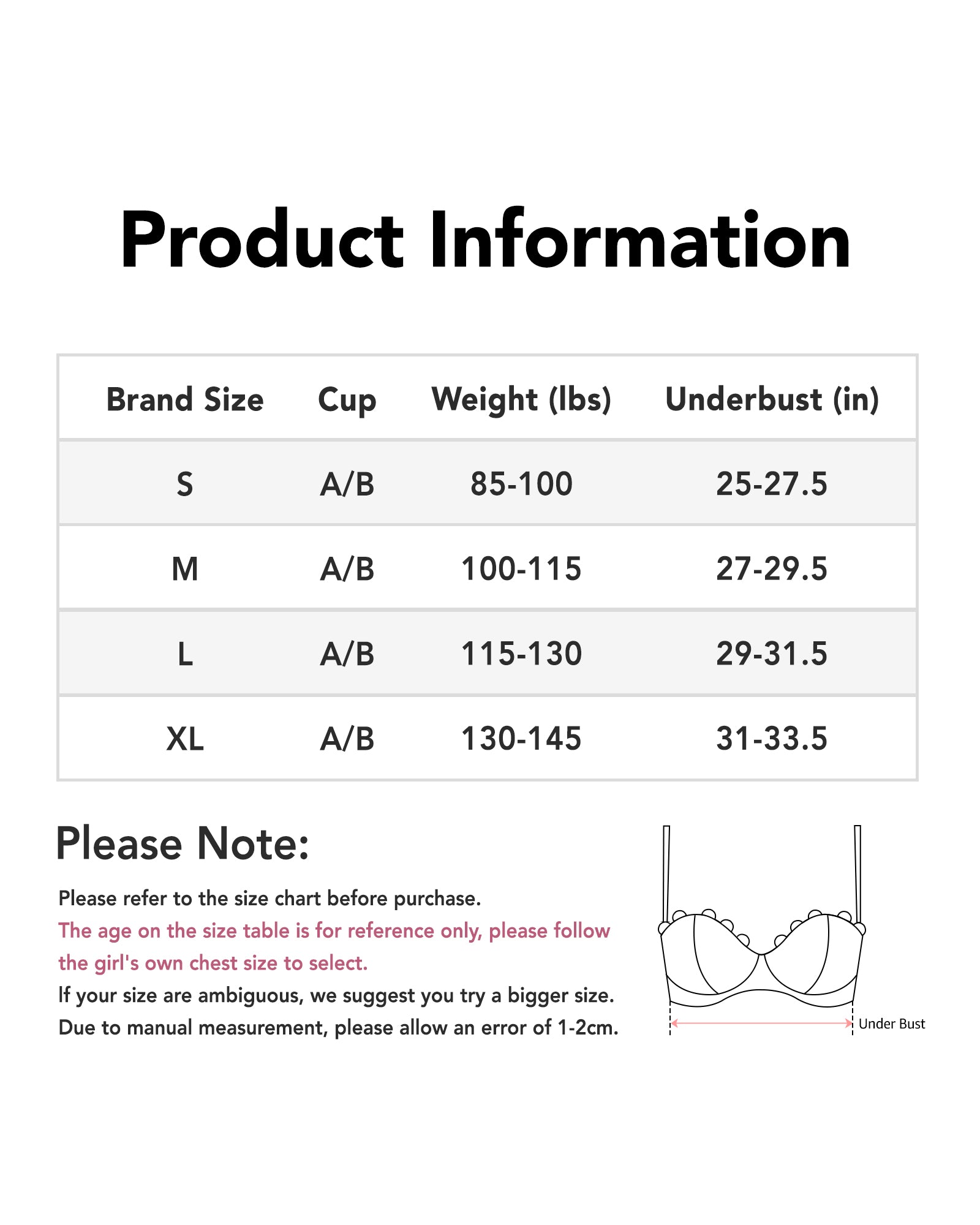 This girls' training bra is ultra-soft comfy for day and night wear (check size chart in image 2), features sewn-in pads for a tailored fit (suitable for 10-18y teens, petite women & various body types), comes with smooth wide adjustable straps that won’t dig into skin for all-activity comfort (ideal for 12-14y), boasts super soft stretch fabric that stays durable and shape-retaining through wear and washes (perfect for 14-16y casual & sports wear), and fits fuller-figured girls, teens, petite women and tween-sized adults—contact us for any sizing assistance.