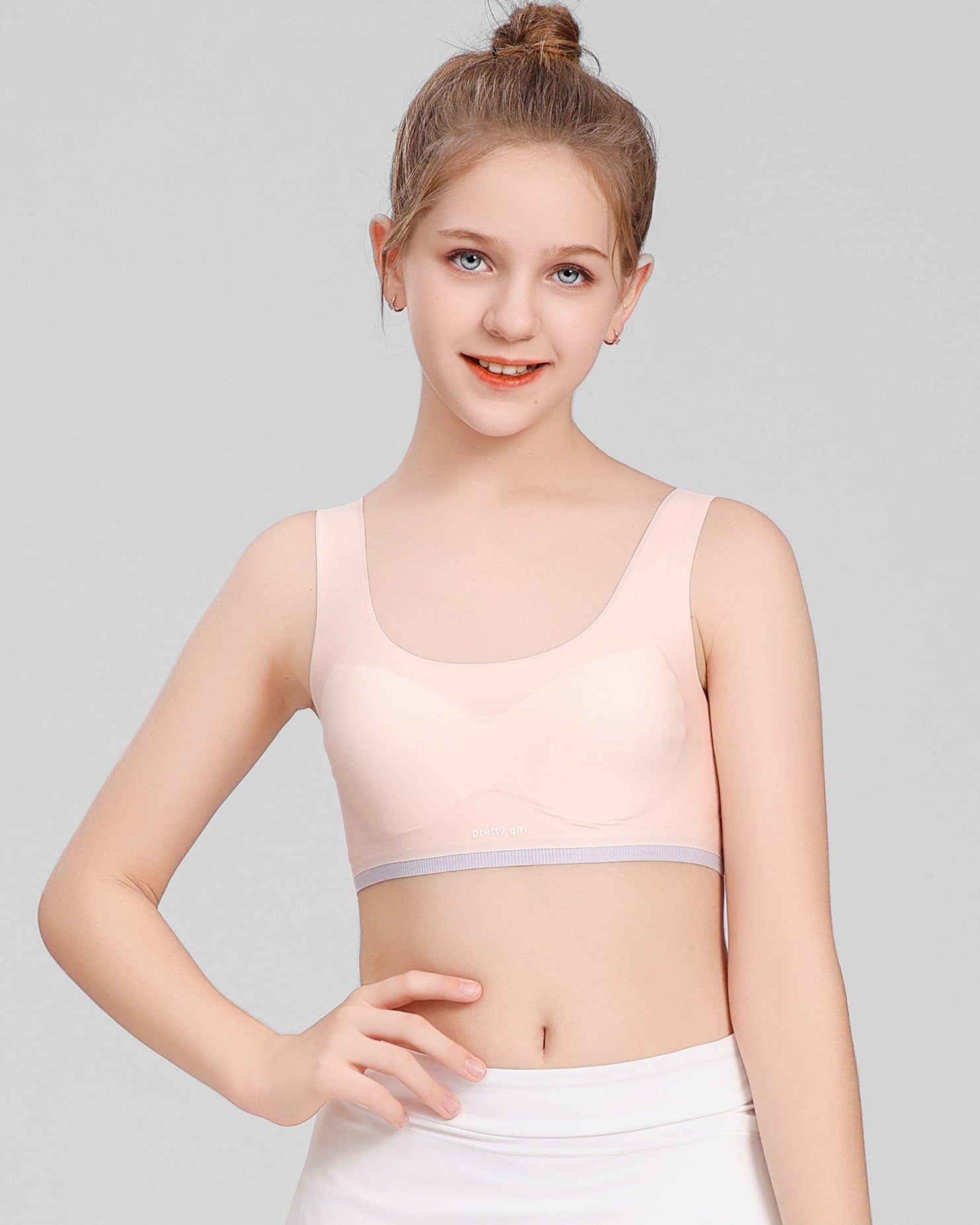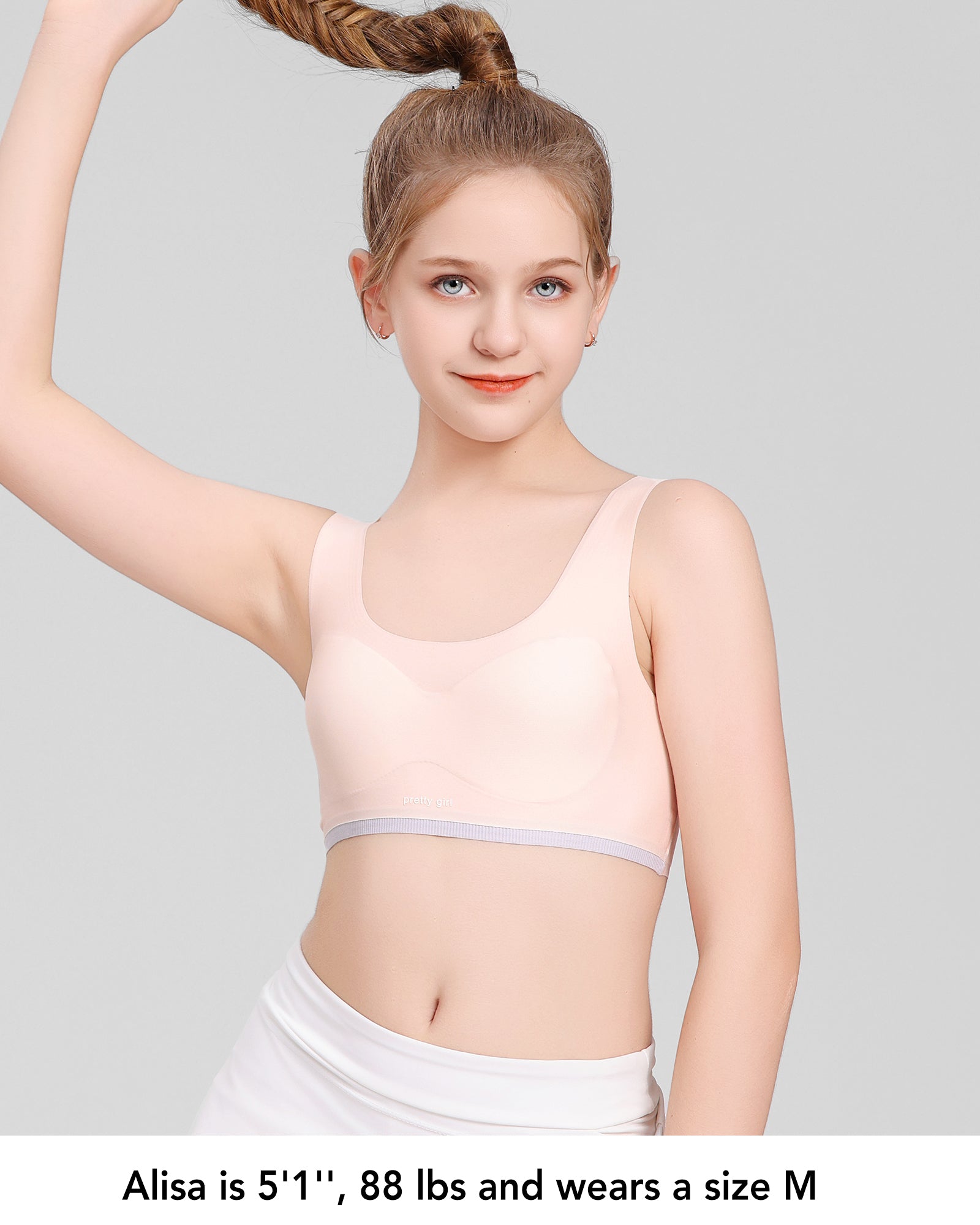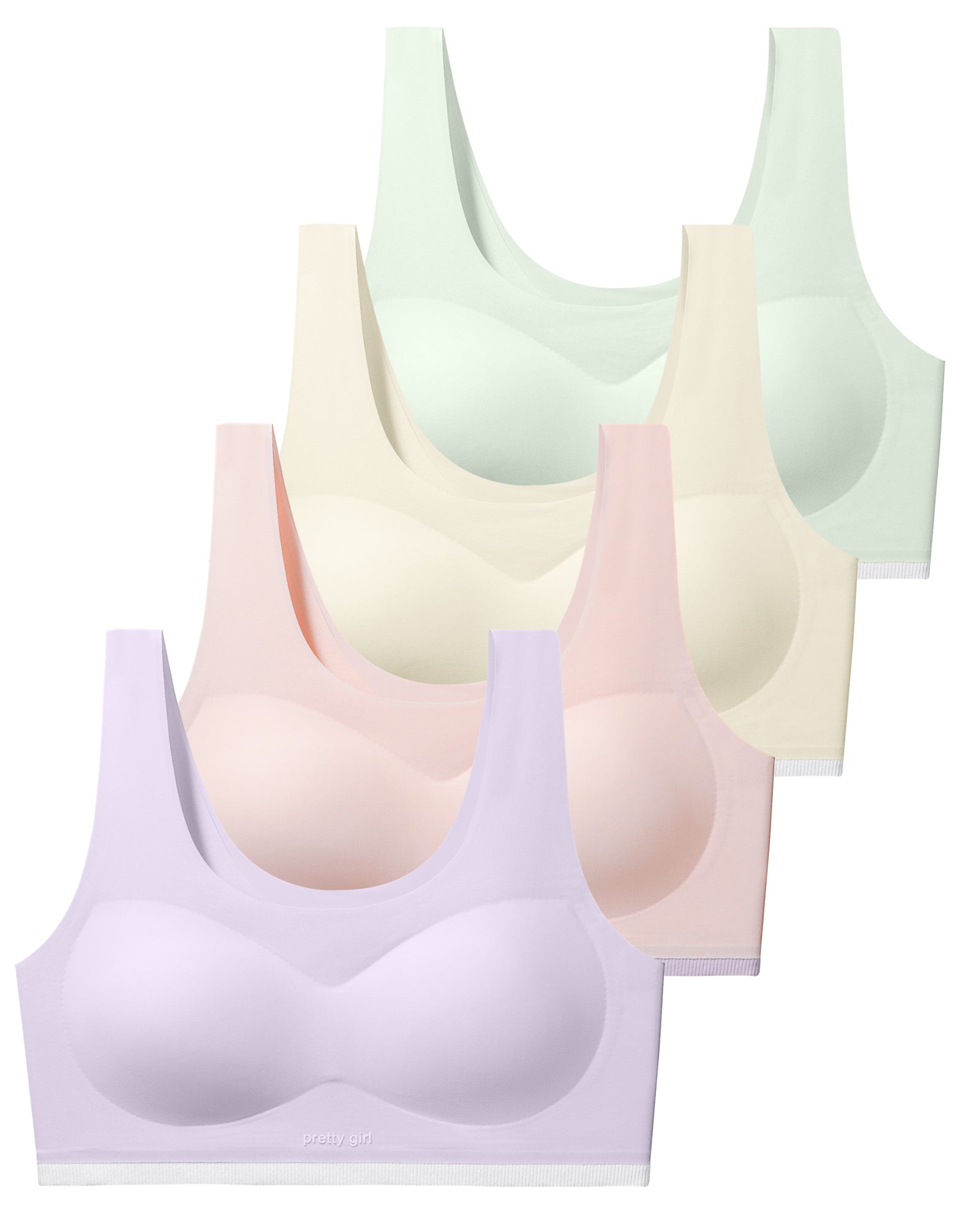 Salia Girl seamless girls training bras feature second-skin lightweight breathable fabric, semi-fixed non-slip thin cups, U-neck & wide shoulder straps for comfy stable support, come as a 4-pack (white/green/pink/purple) fit 10-16Y, eco-friendly durable design with worn returns donated to U.S. charities.